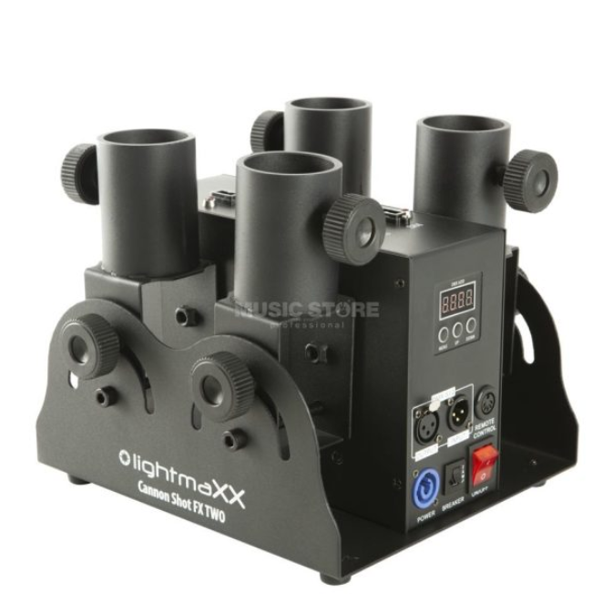 Le LightmaXX Cannon Shot FX FOUR est une unité de tir compacte permettant de lancer des confettis, poudre Holi et serpentins électriques. Ici, quatre canons à confettis et à serpentins peuvent être tirés simultanément ou individuellement. Ceci est possible grâce à la radiocommande fournie ou par DMX.