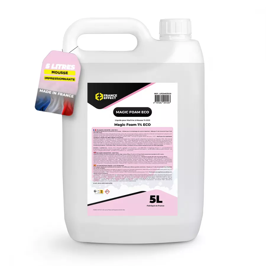 5L pour une utilisation prolongée : Le liquide à mousse Magic Foam ECO est vendu en bidon de 5L, ce qui vous permet de l’utiliser sur une longue période. Il vous permettra de réaliser votre mélange directement dans une cuve pour certaines machines à mousse ou alors de glisser la pipettes pour d’autres machine à mélange automatique.