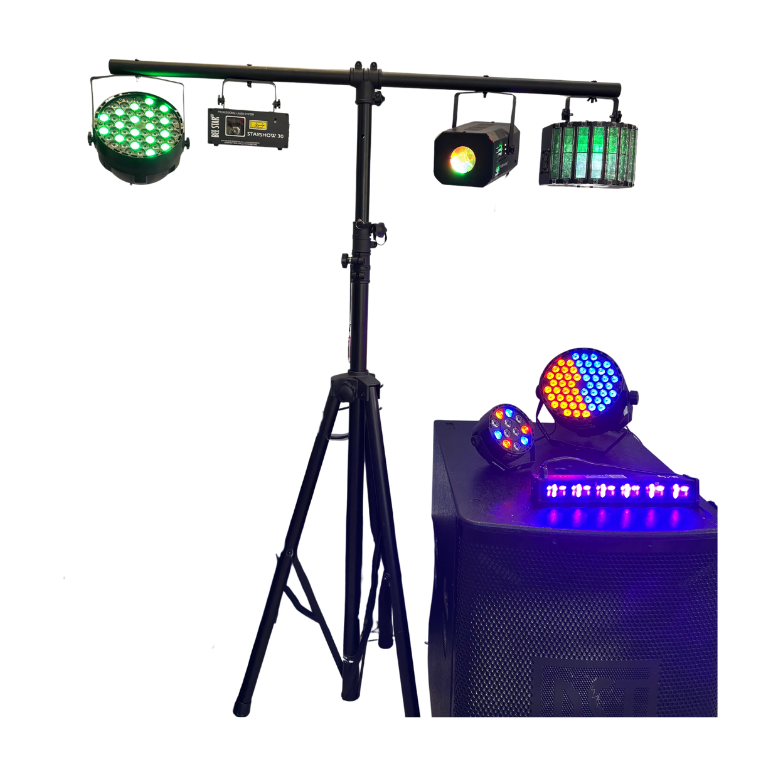 Pack regroupant un portique et 7 jeux de lumière (2 Aydenes + 2 DerbyKolor + 1 rampe Néon UV LED + 1 Laser + 1 Spot 54 LED) et les crochets de fixation nécessaires. Ensemble parfait pour mettre en lumière vos soirées !