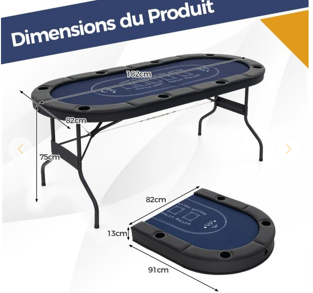 Avec ses dimensions généreuses de 182 x 82 x 75 cm, la table permet d’accueillir 6 à 8 joueurs dans les meilleures conditions. Que vous jouiez au Texas Hold’em, au blackjack ou à tout autre jeu de cartes, son format professionnel garantit fluidité et immersion.
